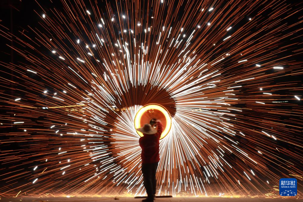 2月18日晚,在河南省安阳市内黄县文化体育中心,民间艺人表演打铁花。