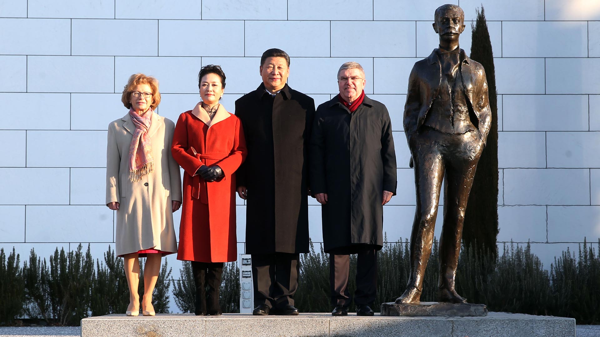 1月18日,國家主席習近平在瑞士洛桑國際奧林匹克博物館會見國際奧林匹克委員會主席巴赫。這是習近平和夫人彭麗媛與巴赫夫婦在現代奧林匹克運動發起人顧拜旦雕像前合影。新華社記者 姚大偉 攝2017-01-19