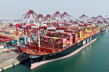 2月18日农历大年初二,山东港口青岛港前湾集装箱码头泊位饱满、高效运行,来自欧洲、地中海、东南亚、中南美航线的20余条集装箱船舶集中到港,载箱量超过8000标准箱的船舶达到8条。