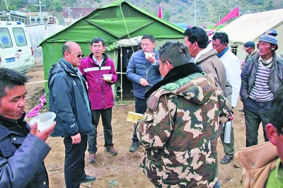 王海(左三)在吉隆鎮災區布置工作。資料照片
