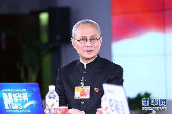 ??? 2015年3月14日,全國人大代表、鳳凰古城文化旅游投資股份有限公司董事長葉文智做客新華會客廳,圖為葉文智在訪談中。新華網 李江 攝