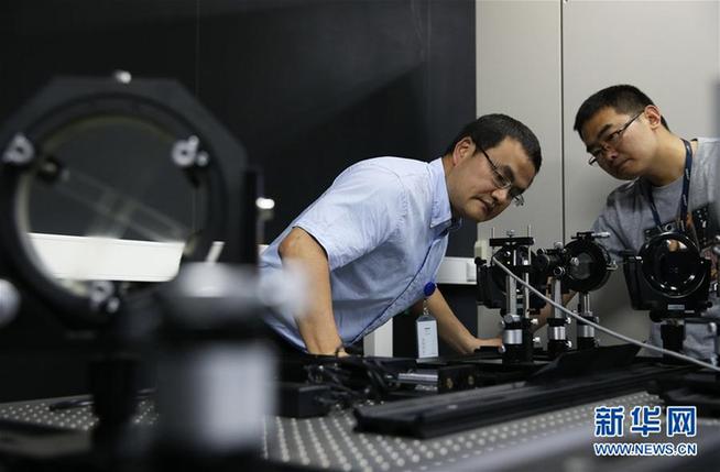 在上海張江國家科學(xué)中心,冷用斌(左)和同事在上海光源同步光診斷實(shí)驗(yàn)室內(nèi)做實(shí)驗(yàn)(2015年5月27日攝)。新華社記者 裴鑫 攝