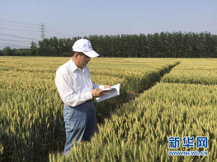 何中虎在中國農業科學院昌平育種實驗站觀察小麥新品種(資料照片)。新華社發