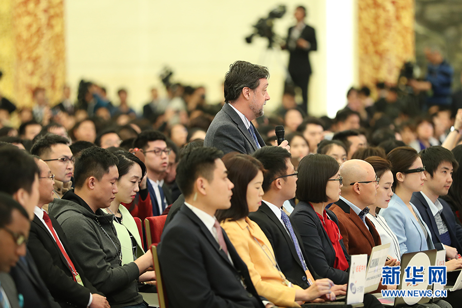 3月15日上午,國務院總理李克強在人民大會堂三樓金色大廳會見采訪十二屆全國人大五次會議的中外記者并回答記者提出的問題。圖為美國有線電視新聞網記者提問。新華網/中國政府網 翟子赫 攝?