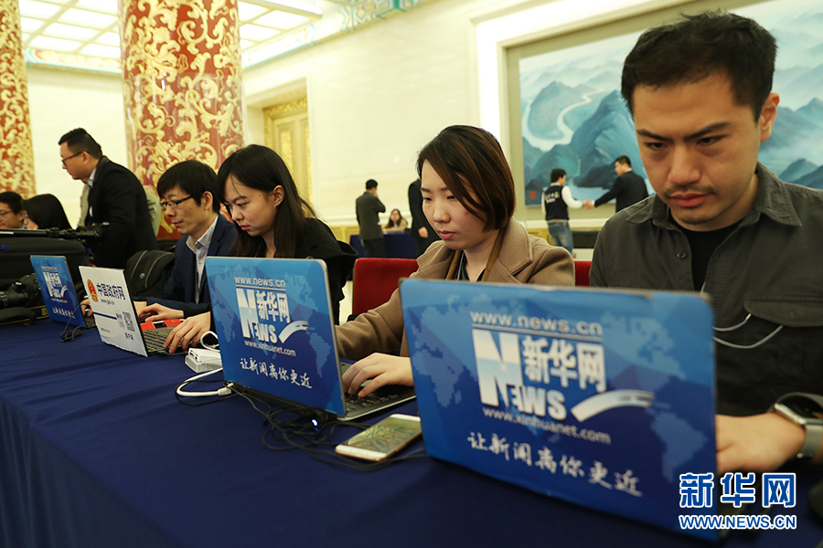 3月15日上午,國(guó)務(wù)院總理李克強(qiáng)在人民大會(huì)堂三樓金色大廳會(huì)見(jiàn)采訪十二屆全國(guó)人大五次會(huì)議的中外記者并回答記者提出的問(wèn)題。圖為新華網(wǎng)記者在做直播準(zhǔn)備。新華網(wǎng)/中國(guó)政府網(wǎng) 翟子赫 攝