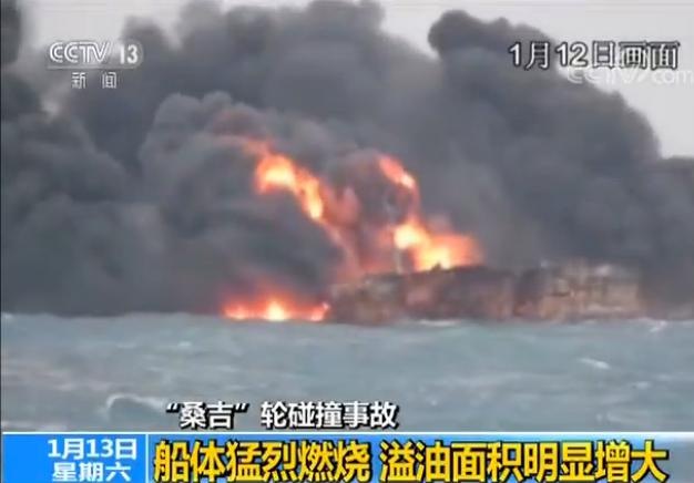 昨天(12日),央視記者登上國家海洋局海監飛機,在空中勘察“桑吉”輪碰撞事故現場。記者發現,桑吉輪船身猛烈燃燒,溢油情況比前兩天明顯增多,火勢已經蔓延到海面,桑吉輪船體傾斜嚴重,非常脆弱。