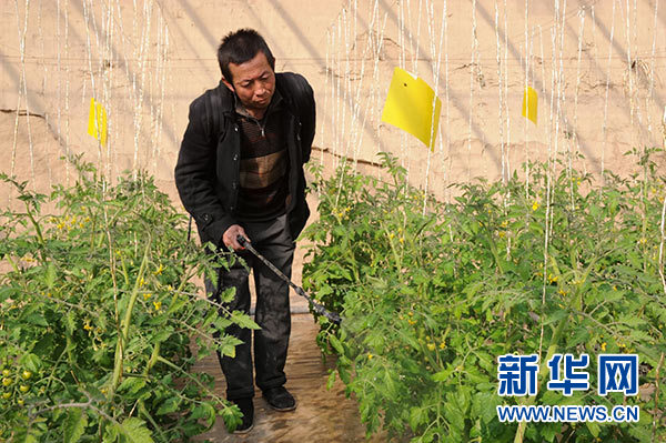 1月19日,甘肅省永靖縣三塬鎮下塬村村民噴灑生物農藥,照料日光溫室里的農作物。新華社發(王銘禹 攝)