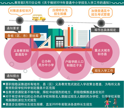 為進(jìn)一步治理義務(wù)教育階段“擇校熱”,解決中小學(xué)招生入學(xué)工作中的熱點(diǎn)難點(diǎn)問題,教育部23日公布《關(guān)于做好2018年普通中小學(xué)招生入學(xué)工作的通知》,對推進(jìn)多校劃片、壓縮特長生招生規(guī)模、加強(qiáng)普通高中招生考試管理等作出具體規(guī)定。>>