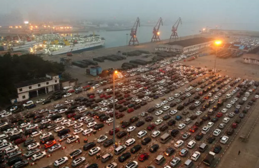 ▲ 2月22日,汽車在??谑行阌⒏鄹蹍^內排隊等待出島。新華社記者趙穎全攝