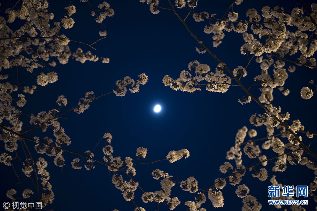 3月25日,揚(yáng)州鑒真大道,夜幕下的櫻花,在燈光月色的輝映下別有一番意境。(圖片來(lái)源:視覺(jué)中國(guó))