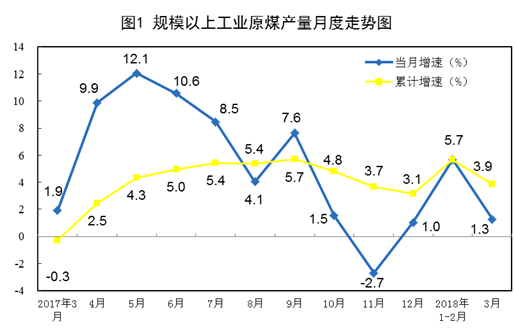 一季度,原煤產(chǎn)量8.0億噸,同比增長(zhǎng)3.9%。3月份,原煤產(chǎn)量同比增長(zhǎng)1.3%,比1-2月份回落4.4個(gè)百分點(diǎn)。