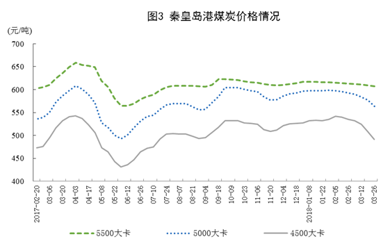 煤炭?jī)r(jià)格有所回落。截至3月底,秦皇島5500大卡煤炭平倉價(jià)為每噸607元,比去年年底下降10元;5000大卡每噸564元,下降33元;4500大卡每噸491元,下降36元。