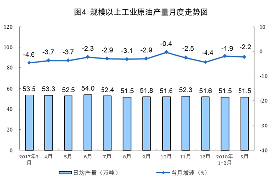 一季度,原油產(chǎn)量4633萬噸,同比下降2.0%,降幅比去年同期收窄4.8個(gè)百分點(diǎn)。3月份,原油生產(chǎn)同比下降2.2%,日均產(chǎn)量51.5萬噸。