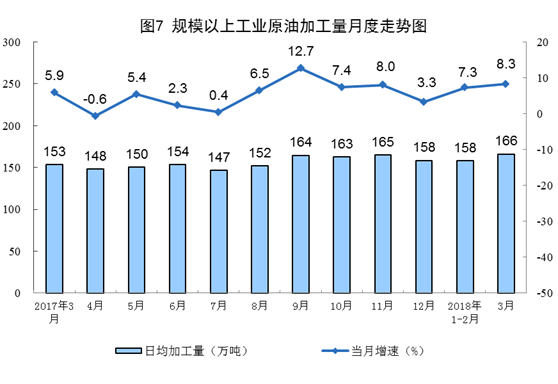 受去年下半年國內(nèi)新增煉化產(chǎn)能陸續(xù)投產(chǎn)和2018年首批原油進(jìn)口配額大幅增加影響,一季度原油加工量明顯增長(zhǎng),同比增長(zhǎng)7.5%,增速比去年同期加快3.0個(gè)百分點(diǎn)。3月份,原油加工量同比增長(zhǎng)8.3%,日均加工166.2萬噸,為歷史最高水平。其中,汽油、煤油和柴油產(chǎn)量分別增長(zhǎng)5.7%、14.6%和1.3%。
