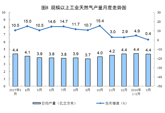 一季度,天然氣產(chǎn)量396.7億立方米,同比增長(zhǎng)3.3%,受基數(shù)較高影響,增速比去年同期回落0.1個(gè)百分點(diǎn)。3月份,天然氣產(chǎn)量同比增長(zhǎng)0.4%,日均生產(chǎn)4.4億立方米,依然保持最高日產(chǎn)水平。