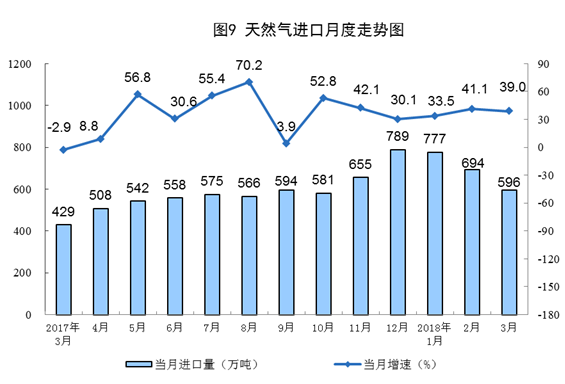 天然氣進(jìn)口高速增長(zhǎng)。一季度,進(jìn)口天然氣2062萬噸,同比增長(zhǎng)37.3%。3月份,進(jìn)口天然氣596萬噸,同比增長(zhǎng)39.0%,增速比1-2月份放緩2.1個(gè)百分點(diǎn)。