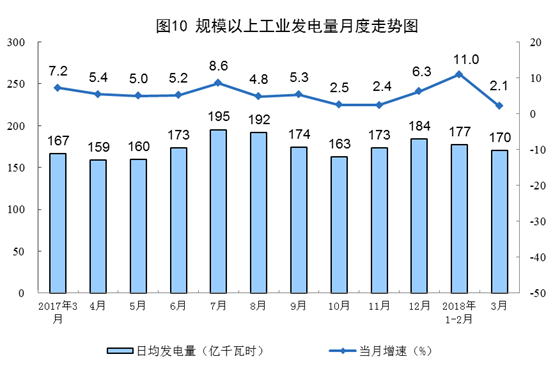 一季度發(fā)電1.6萬億千瓦時(shí),發(fā)電量快速增長(zhǎng),同比增長(zhǎng)8.0%,增速比去年同期加快1.3個(gè)百分點(diǎn)。3月份,全國平均氣溫較常年同期偏高2.9℃,而去年同期氣溫接近常年,且本月較去年同期少1個(gè)工作日,受此影響,發(fā)電量增速有所回落,同比增長(zhǎng)2.1%。