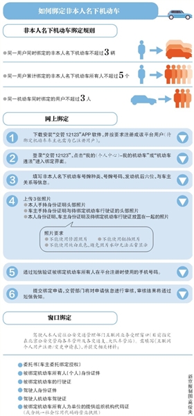 辦理綁定非本人名下機動車業務,有歷史綁定車輛數量的限制:一是同一用戶同時綁定具備相應駕駛資格的機動車不得超過3輛;二是同一用戶累計綁定非本人名下機動車所有人不超過5個;三是同一機動車同時綁定的用戶不超過3人。