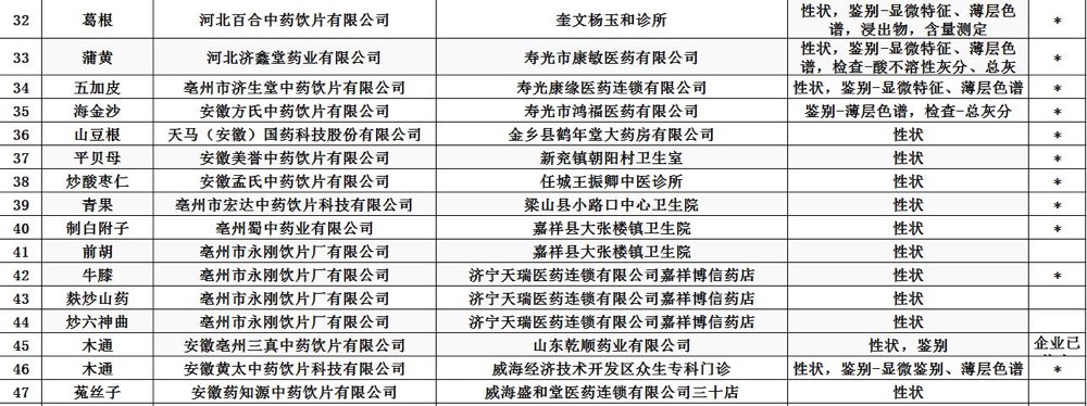 經濱州市食品藥品檢驗檢測中心等14家藥品檢驗機構檢驗,標示為河北凱諾制藥有限公司等2家企業生產的2批次藥品,標示為金芍堂中藥飲片有限公司等47家企業生產的70批次中藥飲片不合格。