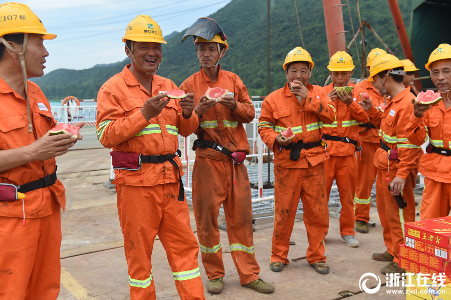 5月16日,杭州持續高溫,最高氣溫達37.5℃。在G25長深高速德清至富陽段擴容工地,工人正在抓緊建設跨富春江大橋。承建施工項目的浙江交工宏途交通建設有限公司,為一線建設者送來了清涼用品和防暑藥品,慰問高溫下作業的施工人員。(浙江在線記者 吳元峰 攝)
