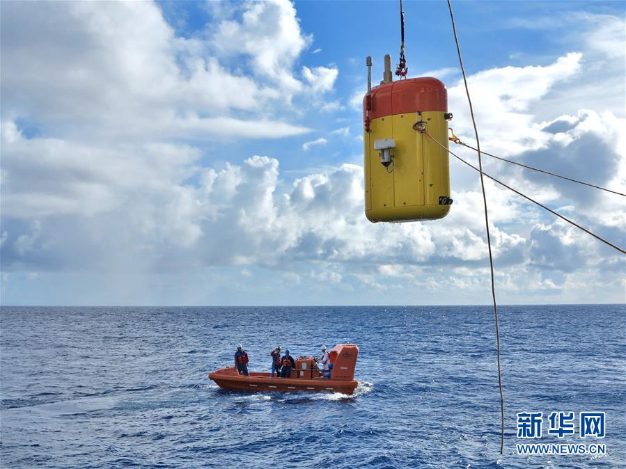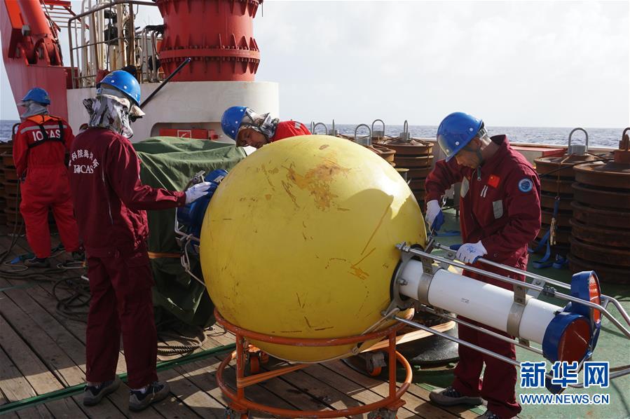 科考隊員在安裝潛標(biāo)的主浮球(2017年12月4日攝)。新華社發(fā)