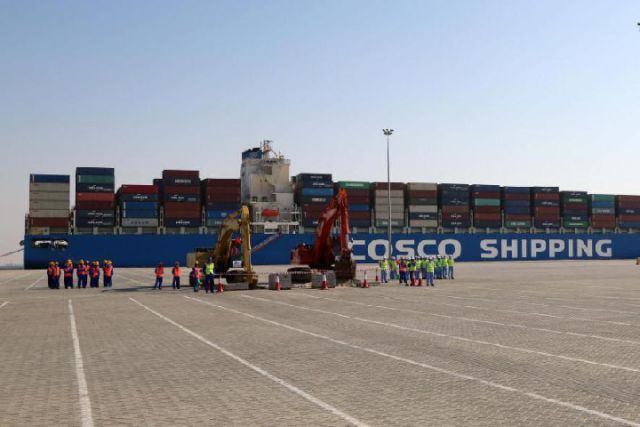 ↑2017年11月5日在阿聯酋拍攝的中遠海運港口阿布扎比碼頭正式動工暨場站租賃簽約儀式現場。 新華社記者蘇小坡攝