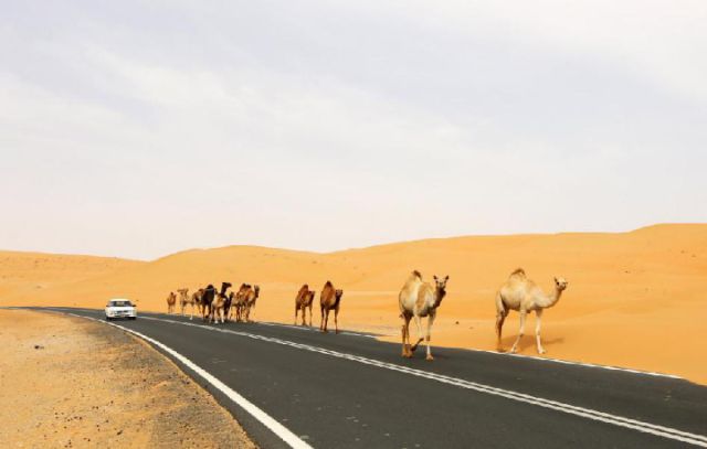 ↑2016年5月6日拍攝的阿聯酋的利瓦沙漠公路上的駝隊。 新華社記者 李震攝