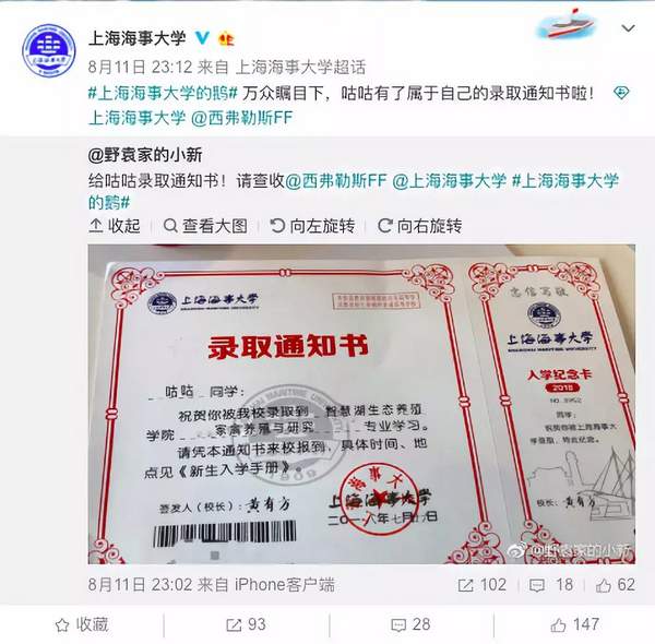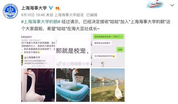 經過請示,上海海事大學回復稱,決定接收這只名叫“咕咕”的鵝加入“上海海事大學的鵝”這個大家庭。