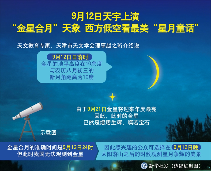 新華社天津9月10日電(記者周潤健)天文專家介紹說,作為行星合月里最美的一幕“星月童話”,“金星合月”12日晚將現身天宇,映美蒼穹。如果天氣晴好,感興趣的公眾抬頭仰望西方低空,憑借肉眼就可欣賞到“維納斯”與“月姑娘”相依相伴的美妙場景。