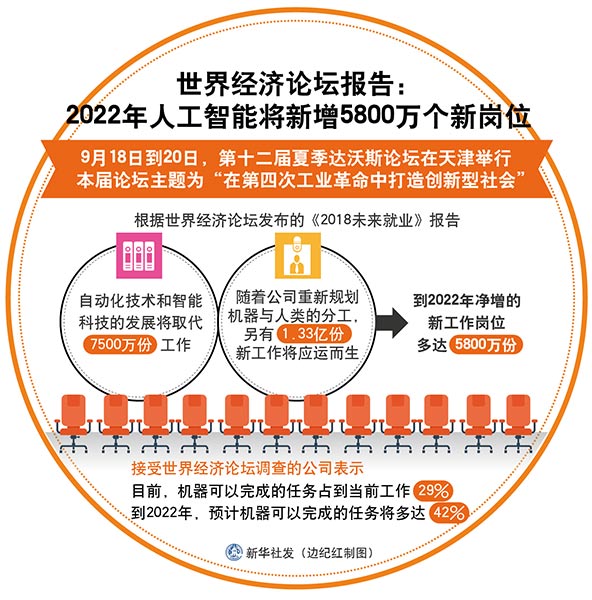 圖表:世界經(jīng)濟(jì)論壇報(bào)告:2022年人工智能將新增5800萬(wàn)個(gè)新崗位 新華社發(fā) 邊紀(jì)紅 制圖