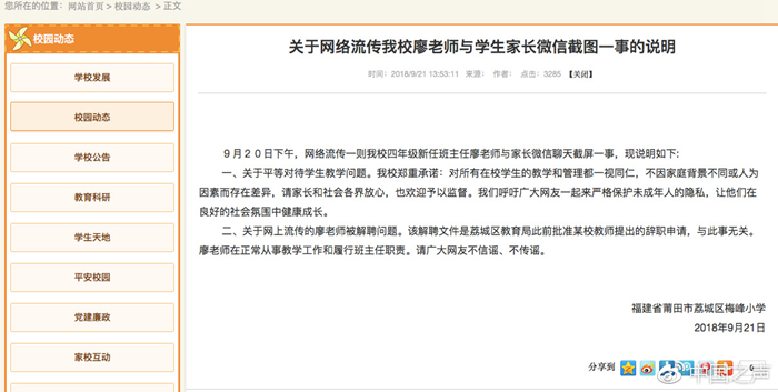 下午,涉事的莆田市荔城區(qū)梅峰小學(xué)在其官方網(wǎng)站發(fā)布消息,該解聘文件是荔城區(qū)教育局此前批準某校教師提出的辭職申請,與此事無關(guān)。廖老師在正常從事教學(xué)工作和履行班主任職責(zé)。