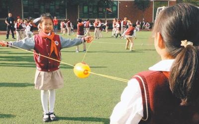武漢市紅領巾學校學生在操場上分組玩“穿梭拉拉球”游戲。本報記者 田豆豆攝
