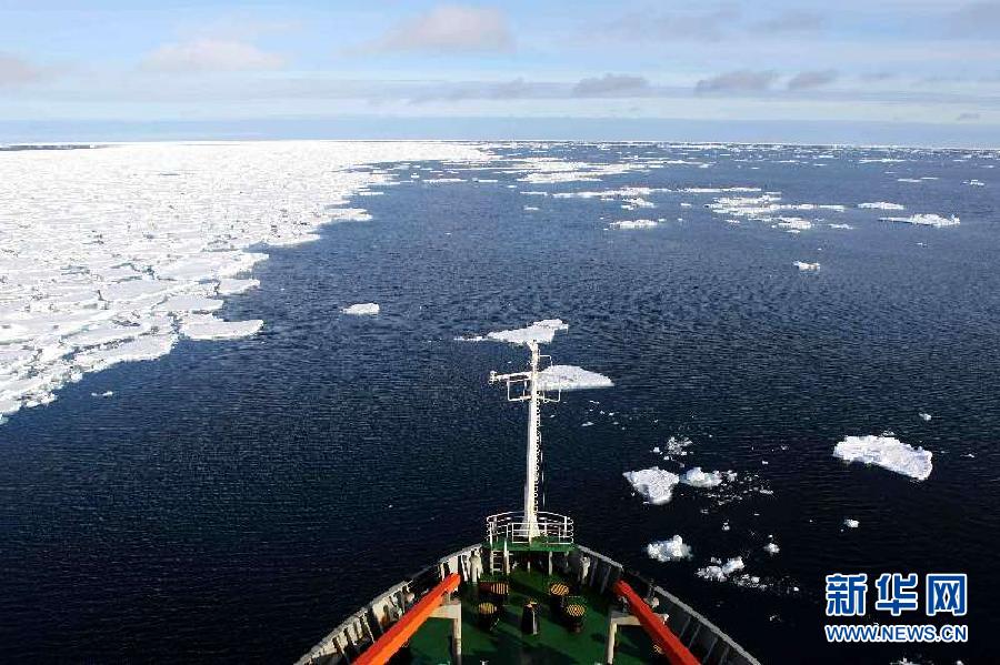 從“雪龍”號駕駛臺上放眼望去,浮冰鋪滿海面,時有冰山立于其間?!把垺碧栄刂”g的空隙行進,碾過浮冰的撞擊聲不時從船底傳來。為減輕船體的震動,航速有所下降,由原來的每小時15節左右降為目前的每小時9節左右(1節約合每小時航行1.852公里)。