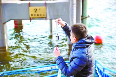 供水調(diào)度的正常開(kāi)展,離不開(kāi)水文人員的辛苦付出。早上8時(shí)許,懷柔水庫(kù)的氣溫在零下9攝氏度左右,水庫(kù)的水文取水點(diǎn)旁,京密引水管理處的水文人員李海春小心翼翼地順著臺(tái)階向水面走去,由于氣溫太低,臺(tái)階欄桿兩側(cè)已結(jié)了厚厚的冰柱,臺(tái)階上也因?yàn)榉e水成冰而變得異常濕滑。來(lái)到水邊,李海春掏出專(zhuān)業(yè)溫度計(jì),順著繩子將它扔進(jìn)水面。“為了測(cè)得更加準(zhǔn)確,必須讓溫度計(jì)在里面至少待5分鐘。”李海春說(shuō)。專(zhuān)業(yè)的水文溫度計(jì)有不銹鋼外表,可以抵擋零下十幾攝氏度的嚴(yán)寒。李海春雖然穿了羽絨服,但站在戶(hù)外,尤其是水邊,5分鐘也是相當(dāng)?shù)碾y熬。