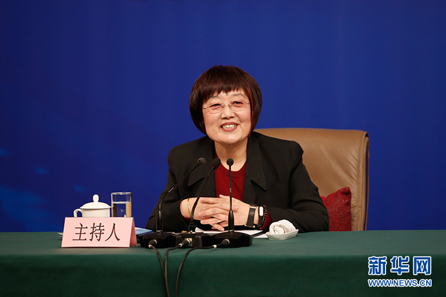 十三屆全國人大一次會議新聞中心于3月7日在梅地亞中心多功能廳舉行記者會,邀請國務院扶貧辦主任劉永富就“打好精準脫貧攻堅戰”的相關問題回答中外記者的提問。圖為記者會主持人王冬梅。新華網/中國政府網 陳杰 攝