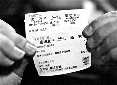 秘京春告訴北京青年報記者,6451次最初是給鐵路職工上下班的通勤車,使用最簡易的車廂,鐵路職工免費乘坐,同時面向社會開放,由于票價低廉,非常貼近普通百姓。但隨著時代發(fā)展,很多老綠皮車線路停運。為留作紀念,秘京春購買了6451/6452次最后一趟的全程車票,單程票價6.5元。但他并不打算坐滿全程,而是到廊坊北下車,再轉(zhuǎn)乘別的列車返京,用他的話說是“買長坐短”。