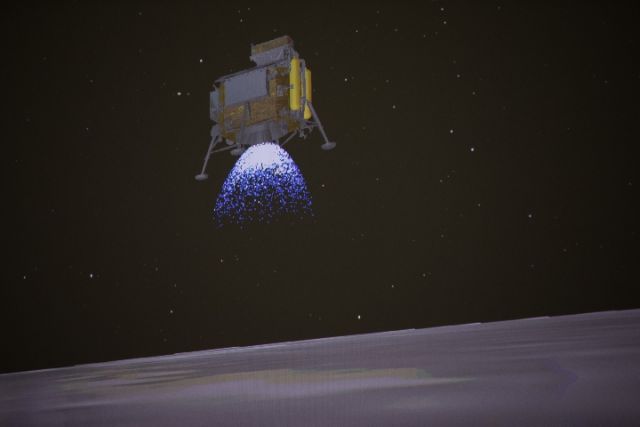 圖為1月3日在北京航天飛行控制中心拍攝的降落過(guò)程(示意圖)。1月3日10時(shí)26分,嫦娥四號(hào)探測(cè)器自主著陸在月球背面南極-艾特肯盆地內(nèi)的馮·卡門(mén)撞擊坑內(nèi),實(shí)現(xiàn)人類探測(cè)器首次在月球背面軟著陸。新華社記者 金立旺 攝