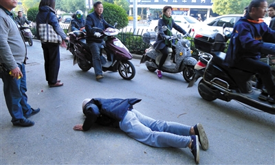2013年11月25日,浙江金華,老人摔倒在地,無人敢扶。 資料圖/視覺中國