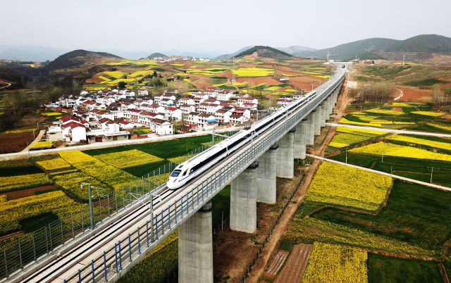 2018年3月21日,一列動車組列車行駛在西成高鐵陜西漢中洋縣段。新華社發(fā)(唐振江 攝)