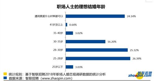 其中也有不少職場人對婚姻的年齡沒有執念,認為真愛才是結婚的前提,24.14%的職場人認為只要遇到真愛隨時都可以結婚。