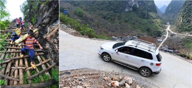 右圖:修通水泥路之后,弄頂屯的家長(zhǎng)開(kāi)著汽車去學(xué)校接孩子回家。(新華社記者黃孝邦攝·2017年)。