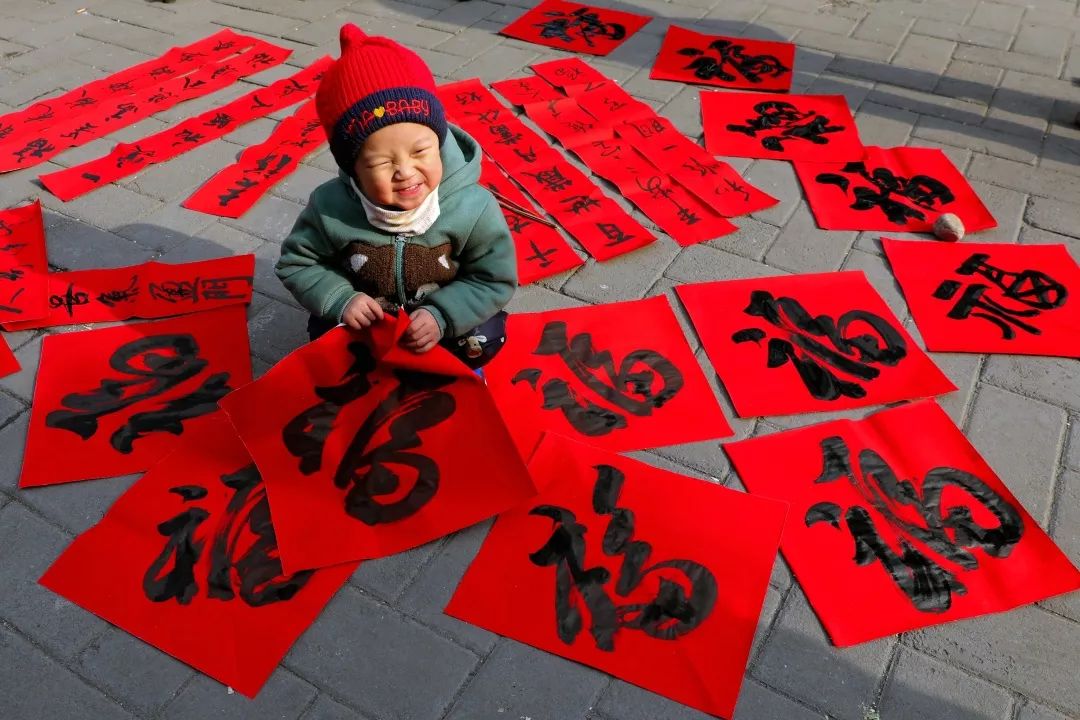 2019-1-28,河北涉縣更樂(lè)鎮(zhèn)。新春到來(lái)之際,書(shū)協(xié)的朋友們?cè)诖髲R里揮毫潑墨寫(xiě)春聯(lián)送鄉(xiāng)親,村娃跑來(lái)湊熱鬧,蹲在福字里陶醉,幸福又快樂(lè)。作者:滄海