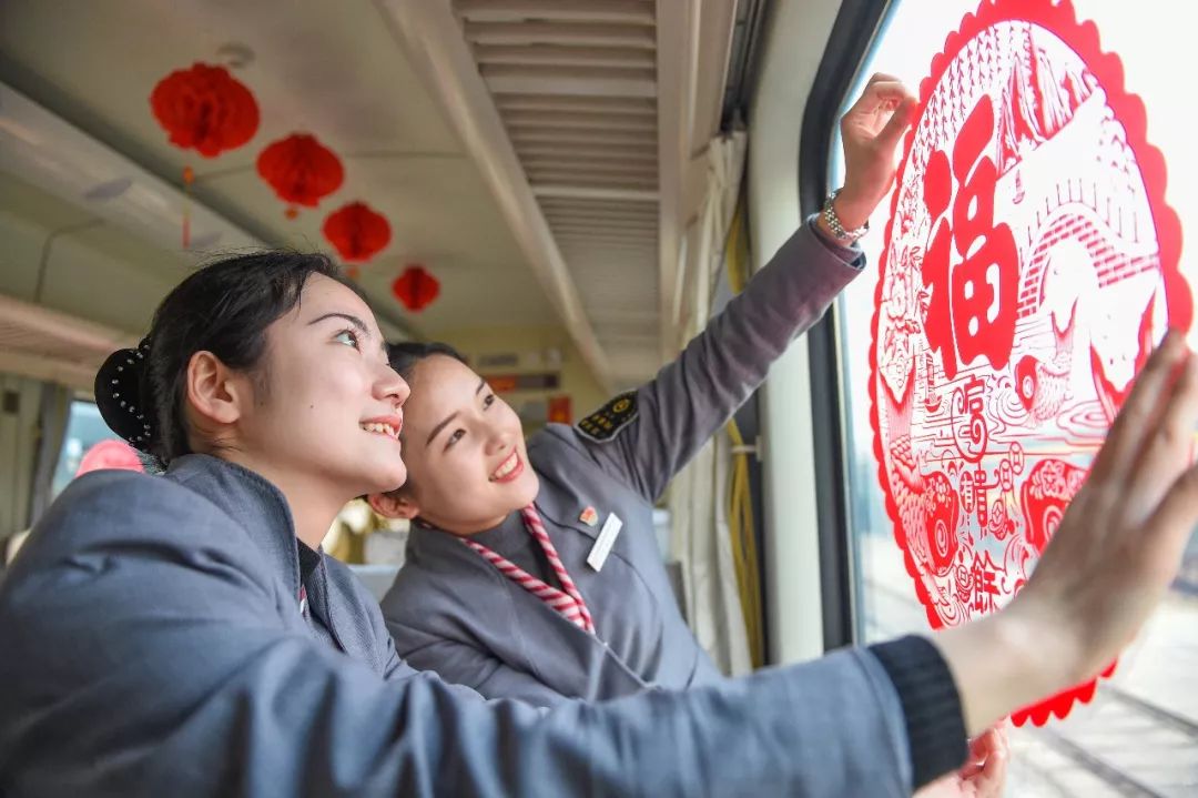 2019-01-29,江西省南昌市。南昌至北京西的Z68次列車上,乘務(wù)員在車上貼上窗花,為旅客準(zhǔn)備免費(fèi)書籍、玩具和春節(jié)物品等,營造濃濃的年味兒。作者:清風(fēng)吹過60年