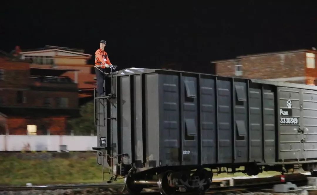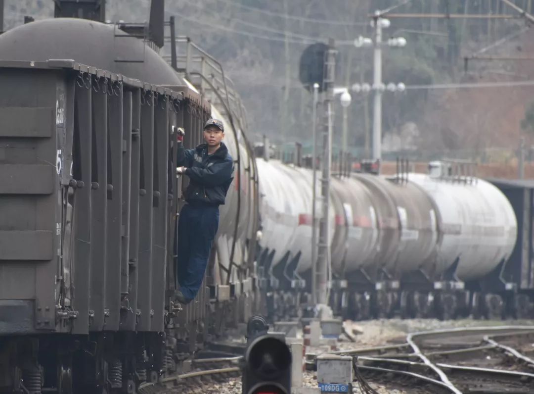 2019-02-02,長沙車務(wù)段路口鋪車站。在搶運(yùn)航油、汽油等油品的專列上,連接員掛在車梯上編組列車。作者:麥子熟了