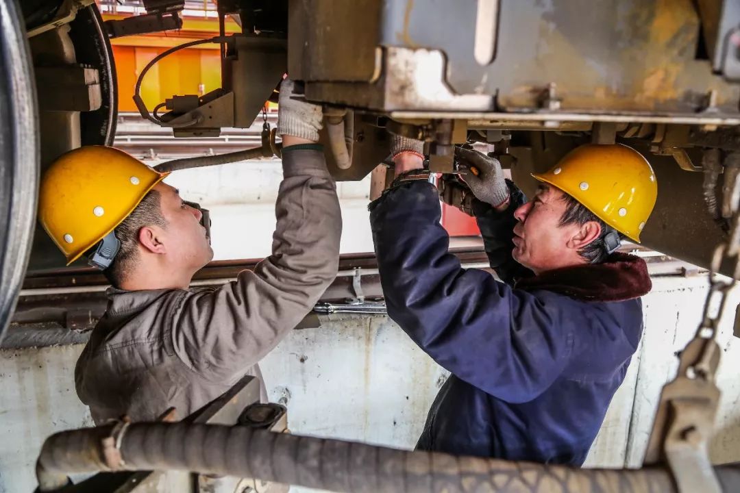 2019-02-08,唐山機(jī)務(wù)段。大年初四,唐山機(jī)務(wù)段的整備人員正在檢修機(jī)車走行部,確保出庫機(jī)車質(zhì)量良好。作者:樂亭閑人