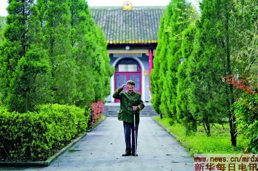 3月27日,程樟柱在紀念館內(nèi)向前來參觀的游客行軍禮。