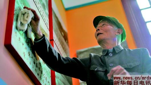 3月27日,程樟柱在紀念館內(nèi)擦拭介紹烈士事跡的展板。