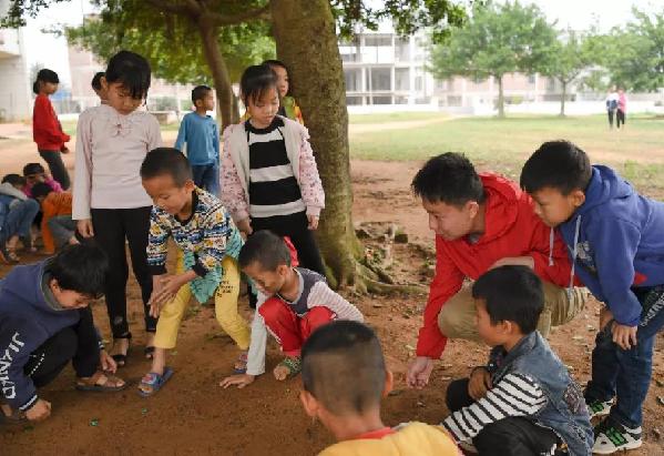 支教老師(右二)在課間和學(xué)生一起玩游戲。鄧華 攝