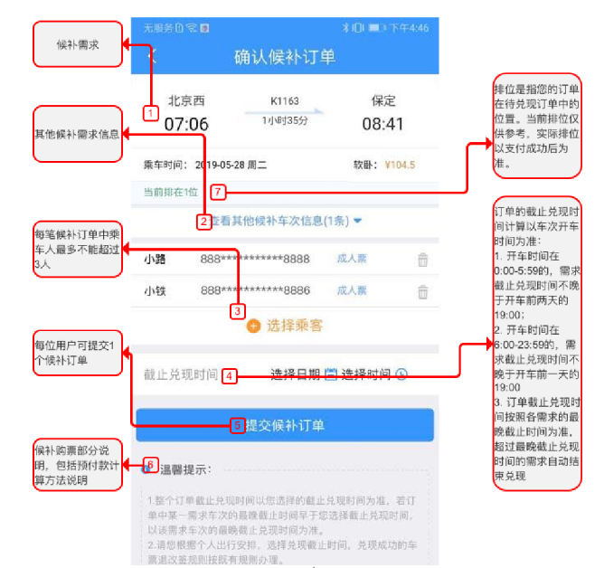 選擇候補購票服務(wù),每位用戶可提交1個候補訂單,1個訂單中可添加始發(fā)站、終到站相同(可以是同城的不同車站)的2個相鄰乘車日期,每個乘車日期可添加2個不同“車次+席別”的組合需求,每個候補訂單可預(yù)訂3張車票。