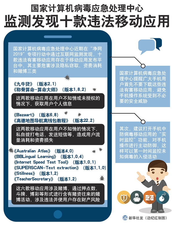 新華社天津5月28日電(記者張建新)國家計算機病毒應急處理中心近期在“凈網2019”專項行動中通過互聯網監測發現,十款違法有害移動應用存在于移動應用發布平臺中,其主要危害涉及隱私竊取、資費消耗和賭博三類。
